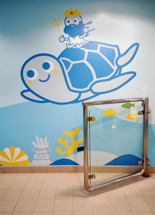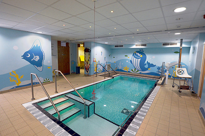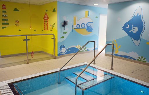 Εκτός από τους τοίχους, τοποθέτησαν και μερικές φιγούρες στο ταβάνι, ώστε να τις βλέπουν παιδιά με κινητικά προβλήματα που τα φέρνουν στον χώρο και τα κατεβάζουν στην πισίνα οι θεραπευτές.