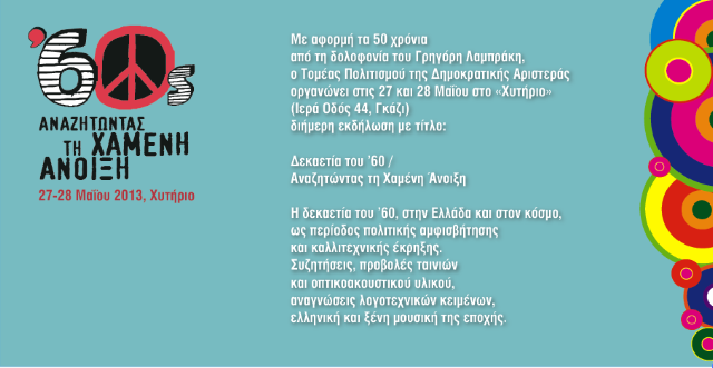 Με αφορμή τα πενήντα χρόνια από τη δολοφονία του Γρηγόρη Λαμπράκη, ο Τομέας Πολιτισμού της Δημοκρατικής Αριστεράς οργανώνει στις 27 και 28 Μαΐου στον πολυχώρο «Χυτήριο» (Ιερά Οδός 44, Γκάζι) διήμερη εκδήλωση με τίτλο: