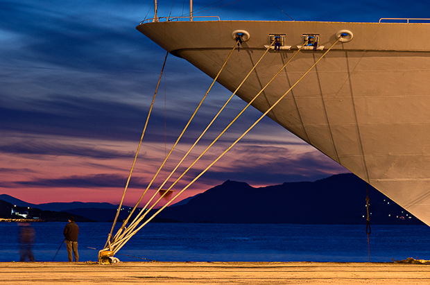 Μας καλεί να δούμε με τις φωτογραφίες του τον Πειραιά τη νύχτα. Να δούμε τη στάσιμη πλευρά του. Χαρακτηριστικά σημεία της ακτογραμμής το βράδυ, που στέκουν πάντα εκεί για το καλωσόρισμα ή για τον αποχωρισμό, σε αντίθεση με τη συνεχή κίνηση επιβατών και πλοίων.
