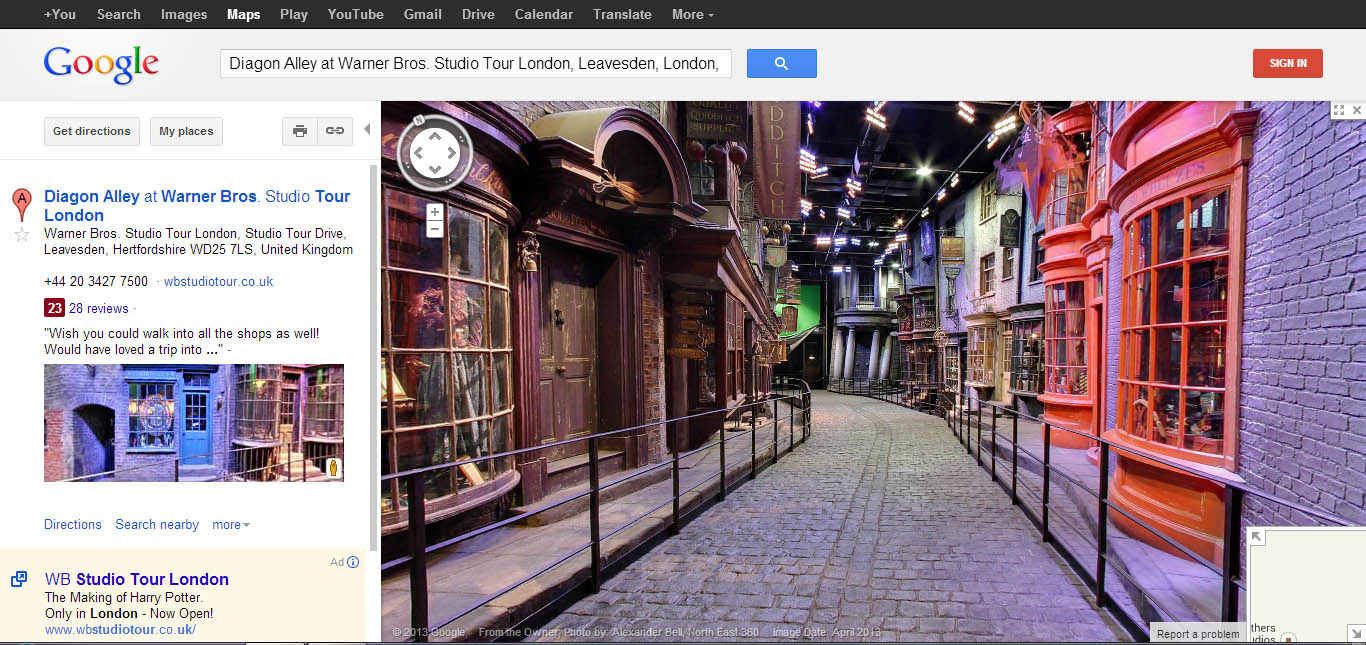 Η είδηση είναι ότι η Διαγώνιος Αλέα, η Diagon Alley, όπου ο Χάρι Πότερ αγόρασε όλα τα αναγκαία προτού πάει στο Χόγκουαρτς για να σπουδάσει μαγεία, εδώ και λίγες μέρες προστέθηκε στο street view mode των Google Maps. Eντάξει, όχι ακριβώς η ίδια η η Diagon Alley, μάλλον τα σκηνικά, το όλο σετ —που περιλαμβάνει κάπου 20.000 αντικείμενα τα οποία διακρίνονται στις βιτρίνες των καταστημάτων (χρειάστηκαν έξι μήνες να κατασκευαστούν)— των οχτώ ταινιών Χάρι Πότερ. Δηλαδή, τυπικά η Google χαρτογράφησε ένα υπαρκτό μέρος του κόσμου, ένα τμήμα των στούντιο της Warner Bros στο Leavesden του Hertfordshire.