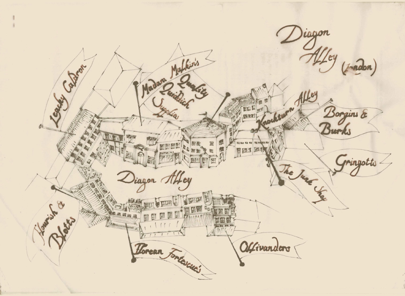Το τούβλο που είχε χτυπήσει, άρχισε ξαφνικά να τρέμει, μετά σχίστηκε στα δύο κι ένα άνοιγμα φάνηκε· ένα άνοιγμα που μεγάλωνε καθώς το κοιτούσαν. Το άνοιγμα πήρε το σχήμα καμάρας και συνέχισε να μεγαλώνει, ώσπου έγινε αρκετά μεγάλο ακόμη και για τον ίδιο τον Χάγκριντ. Κι από αυτό το άνοιγμα φαινόταν τώρα η αρχή ενός πλακόστρωτου δρόμου, με πολλές στροφές, που χανόταν στο βάθος.