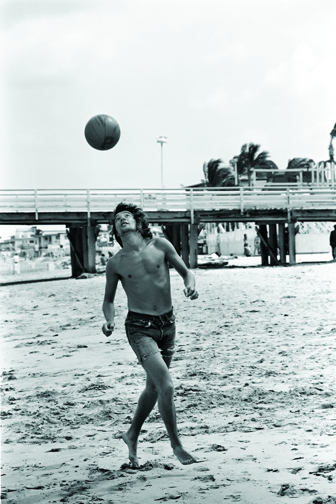 Rod Stewart playing on the beach in Hollywood, Florida, before a concert by Rod Stewart and the Faces, April 1972.