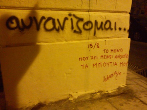 «Δεκαπενταύγουστος. Μόνο τα μπούτια μου είναι ανοιχτά». Το παλιό —σβησμένο τώρα πια— σύνθημα στα Εξάρχεια, περιέγραφε, στις αρχές της δεκαετίας του ’90, με τον δικό του ιδιαίτερο τρόπο τη θερινή αστική ερήμωση αλλά και την ανάγκη για ανθρώπινη επαφή. Σαν τον γέρο-Φραγκούλη στον παπαδιαμαντικό Ρεμβασμό του Δεκαπενταύγουστου, η κοπέλα (;) που έφτιαξε το γκράφιτι, ίσως «ηγάπα και ημάρτανε», δεν ξέρουμε όμως αν ύστερα «μετενόει». Υποθέτω πως όχι. Αλλά ας μη γυρεύουμε μετάνοιες. Οι ήρωες του δεκαπενταύγουστου έχουν κάτι «ανθρώπινο, πολύ ανθρώπινο», ακριβώς γιατί παραμένουν «ατελείς» μέσα στο θέρος. (Και πάλι ο Παπαδιαμάντης για τον ήρωα του : «αλλ’ ὅσον τρυφερὸς ἦτο εἰς τὸν ἔρωτα, τόσον εὐεπίφορος εἰς τὸ πεῖσμα, καὶ τόσον γοργὸς εἰς ὀργήν. Ὤ! ἀτέλειαι τῶν ανθρώπων»). Όσοι έχουν (ξε)μείνει στην Αθήνα τον δεκαπενταύγουστο, ξέρουν από πρώτο χέρι πως η πόλη μοιάζει πολύ με εκείνη την τριώροφη πολυκατοικία που δείχνει ο Γιάνναρης στην ταινία του (Δεκαπενταύγουστος): μια κάθετη παρακμιακή αρχιτεκτονική, γεμάτη από λειψές, τετριμμένες, καθημερινές ιστορίες κουρασμένων και ευάλωτων ανθρώπων που περιμένουν ένα θαύμα για να πιστέψουν ξανά στη ζωή.
