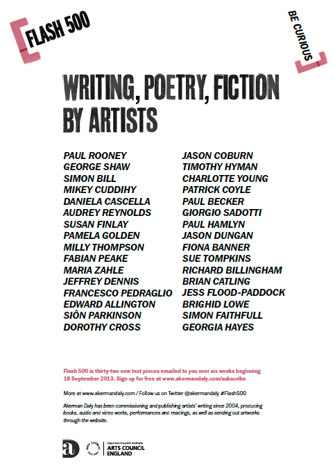 Αν εγγραφείτε στη mailing list, κάθε εβδομάδα θα έρχονται στο mail σας πέντε ιστορίες ─500 λέξεων ακριβώς η κάθε μία αλλά με ελεύθερο θέμα─ από γνωστούς καλλιτέχνες όπως η Fiona Banner, ο Richard Billlingham και ο George Shaw. «Η γλώσσα και το κείμενο-ως εικόνα είναι ένα πλούσιο πεδίο το οποίο καλλιτέχνες εξερευνούν στην τέχνη τους ολοένα και περισσότερο. Τι θέλουν λοιπόν οι καλλιτέχνες από τις λέξεις και για ποιο πράγμα γράφουν;», ρωτάει η ιστοσελίδα των Akerman Daly.