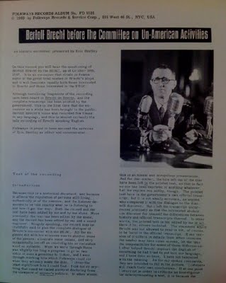 Η κατάθεση του Μπρεχτ, ορισμός της αποστασιοποίησης, θα μπορούσε να είναι μια παράσταση έργου που έγραψε ο ίδιος. Εμφανίστηκε ντυμένος επίσημα και καπνίζοντας ένα τεράστιο πούρο (παρά λίγο να ξεκάνει τη μισή