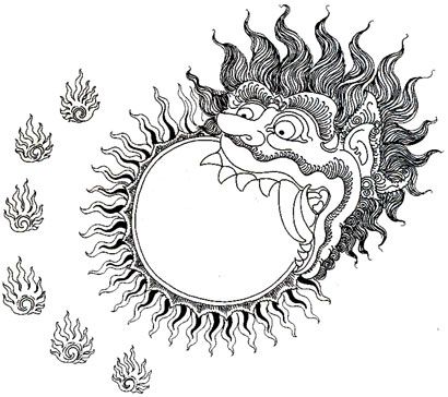 Ένας από τους πιο γλαφυρούς μύθους έρχεται από τους Ινδουιστές: ο δαίμονας Rahu μεταμφιέζεται σε θεό για να κλέψει μια γουλιά από το ελιξίριο της αιώνιας ζωής. Ο ήλιος και το φεγγάρι τον παίρνουν χαμπάρι και τον προδίδουν στον θεό Vishnu που καταφέρνει να αποκεφαλίσει τον Rahu προτού προλάβει να καταπιεί το ελιξίριο με αποτέλεσμα το μεν κεφάλι του να μείνει αθάνατο αλλά το σώμα του να πεθάνει. Το κεφάλι τού Rahu συνεχίζει την πορεία του μέσα στο στερέωμα καταδιώκοντας τον ήλιο και το φεγγάρι για να πάρει την εκδίκησή του και όποτε τα φτάνει τα καταπίνει. Μιας και δεν έχει, όμως, λαιμό ο ήλιος και η σελήνη πέφτουν πάλι έξω από την τρύπα στη βάση τού κεφαλιού του.