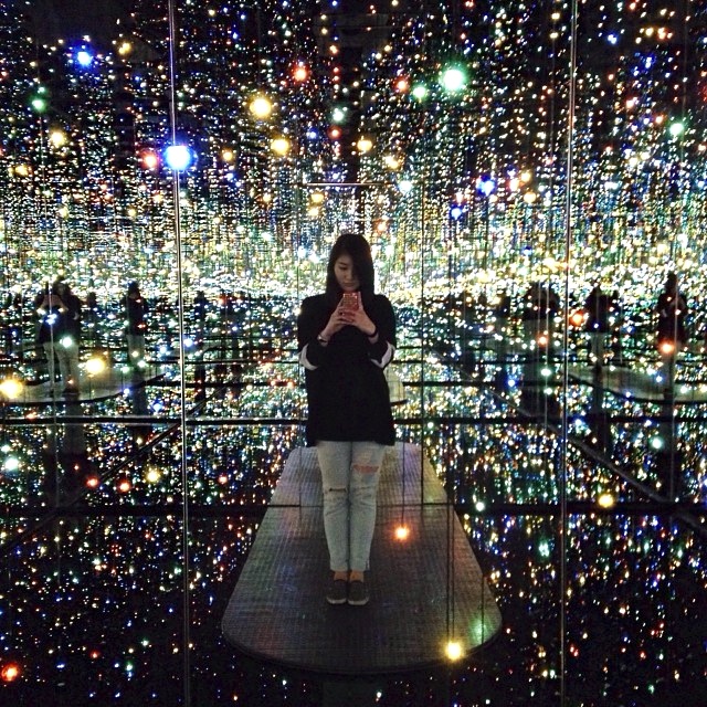 Στο Infinity Mirrored Room, εκατοντάδες πολύχρωμα LED φώτα αιωρούνται αναβοσβήνοντας από το ταβάνι ώς το πάτωμα, σε διάφορα ύψη, μέσα στο επενδυμένο με καθρέφτες δωμάτιο, και δίνουν την αίσθηση στον επισκέπτη πως βρίσκεται μέσα σε έναν γαλαξία ή σε ένα σύννεφο από αστερόσκονη. Η Kusama έχει κάνει παρόμοιες εγκαταστάσεις τόσο στην Tate Modern τού Λονδίνου (Infinity Mirror Room) όσο και στο Whitney τής Νέας Υόρκης (Fireflies in the Water) – η συγκεκριμένη όμως έγινε ειδικά για αυτή την έκθεση και υπόσχεται μια εξίσου σουρεαλιστική εμπειρία.