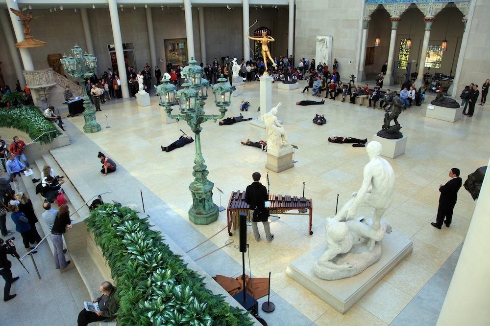 Οι Alarm Will Sound είναι ένα 20μελές πρωτοποριακό ανσάμπλ σύγχρονης μουσικής το οποίο ξεκίνησε στα μέσα Οκτωβρίου την διάρκειας ενός έτους συνεργασία του με το MET με ένα κονσέρτο στο auditorium τού Μουσείου. Λίγες εβδομάδες αργότερα, το απόγευμα της Δευτέρας 18 Νοεμβρίου, μπροστά στα έκπληκτα μάτια όσων βρίσκονταν εκείνη τη στιγμή στο αίθριο τού μουσείου έδωσαν άλλη μια διαφορετική, λιγότερη συμβατική, παράσταση. Ξάπλωσαν ένας-ένας στο μαρμάρινο πάτωμα και εκτέλεσαν από ύπτια θέση το κομμάτι Cliffs του Aphex Twin.