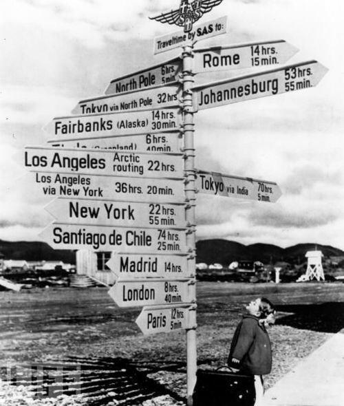 1955, Νορβηγία : Μια νεαρά επιβάτις προσπαθεί να επιλέξει προορισμό για το πρώτο της αεροπορικό ταξίδι. Στο αεροδρόμιο του Bodö, το οποίο βρίσκεται πάνω από τον αρκτικό κύκλο, οι Σκανδιναυικές αερογραμμές είχαν μεριμνήσει να βοηθούν πιλότους και επιβατικό κοινό να βρίσκουν τον προσανατολισμό τους, αλλά και να συμφιλιώνονται με την αναμενόμενη διάρκεια πτήσης. Καθώς φαίνεται, αν η μικρή θέλει απλώς να αποδράσει για τριήμερο, θα πρέπει να διαλέξει τον Βόρειο Πόλο, ενώ, αν έχει πρόθεση να ρίξει μαύρη πέτρα πίσω της, η σοφότερη επιλογή είναι το Σαντιάγο της Χιλής.