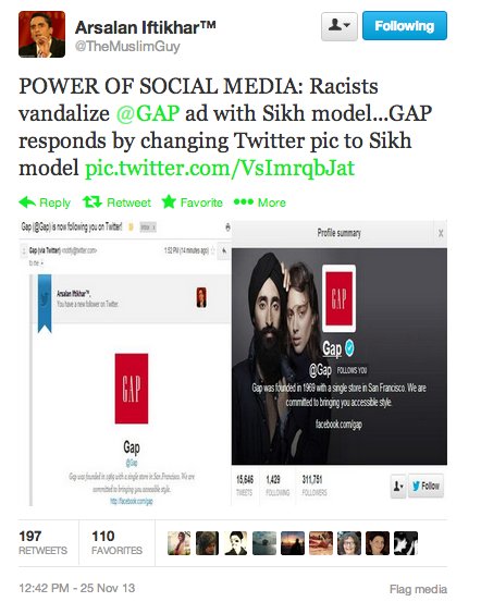 Ο Ifthikhar κοινοποίησε την ίδια στιγμή την άμεση αντίδραση τής Gap, πάλι μέσω tweet, στο οποίο έγραφε: «Η ΔΥΝΑΜΗ ΤΩΝ SOCIAL MEDIA: Ρατσιστικά μηνύματα στη διαφήμιση με Σιχ μοντέλο. Η Gap απαντάει αλλάζοντας την φωτογραφία-φόντο στον λογαριασμό της και βάζοντας εκείνη του Σιχ ηθοποιού».