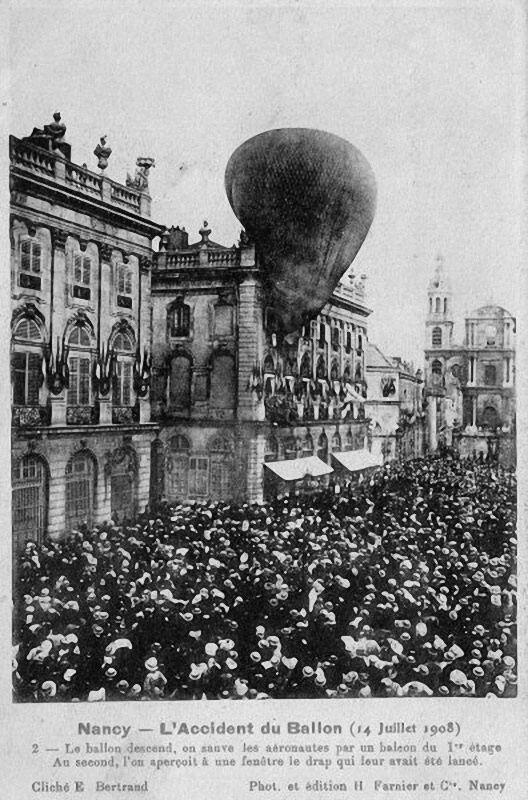 14 Ιουλίου 1908, Nancy, Γαλλία. Συγκεντρωμένα τα πλήθη για τον εορτασμό της Μέρας της Βαστίλης στα πλαίσια του οποίου και αυτή η άδοξη πτήση αερόστατου. Το αερόστατο, η πιο παλιά πτητική τεχνολογία, εφεύρεση των γάλλων αδελφών Μονγκολφιέ, έκανε την πρώτη του επανδρωμένη (μη προσδεμένη στο έδαφος) πτήση στις 21 Νοεμβρίου 1783, στο Παρίσι, με πλήρωμα τους Jean-François Pilâtre de Rozier και François Laurent d’Arlandes. Στα 230 χρόνια που έχουν μεσολαβήσει από τότε ως σήμερα έχουν σημειωθεί μόνο 7 θανατηφόρα ατυχήματα, το πιο πολύνεκρο από τα οποία (με 40 νεκρούς σε αέρα και έδαφος) συνέβη φέτος, στις 26 Φεβρουαρίου, στο Λούξορ της Αιγύπτου. Το αερόστατο της φωτογραφίας πάντως απλώς τάραξε την ηρεμία των κατοίκων του πρώτου ορόφου που αναγκάστηκαν να φιλοξενήσουν τους επιβαίνοντες στο μπαλκόνι τους. Και, κατά πάσα περίπτωση, έσκισε και μια κουρτίνα στον δεύτερο.