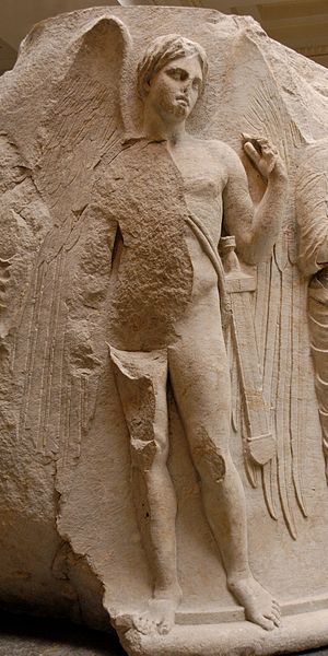 Η αρχαιοελληνική θεότητα με το όνομα Θάνατος δεν είναι πλάσμα του Κάτω Κόσμου και συνεπώς παίρνει μορφές πολύ πιο αφηρημένες. Γιός της Νυκτός και δίδυμος αδελφός του Ύπνου (Σ.τ.Μ: κατά τον Ησίοδο), ήταν υπεύθυνος για την μεταφορά των θνητών στον Κάτω Κόσμο. Μια μαρμάρινη στήλη του 4ου αιώνα στον ναό της Αρτέμιδος στη Έφεσσο τον απεικονίζει σαν όμορφο φτερωτό νέο με σπαθί μέσα σε θήκη που φοράει γύρω από τη μέση του. Σε αντίθεση με τους θεούς του Κάτω Κόσμου, ο Θάνατος έχει διαμεσολαβητικό ρόλο, εξ ου και το αξιωσημείωτα όμορφο παρουσιαστικό του. Δεδομένου ότι οι Έλληνες φιλόσοφοι πρέσβευαν τη σχέση ανάμεσα στο όμορφο και το καλό, η αναπαραστάση στην τέχνη του Θανάτου ως όμορφου στην όψη, λεπτεπίλεπτου αγοριού μαρτυρά την ανάδυση μιας νέας θεώρησης του θανάτου που ενστερνίζεται την αναγκαιότητα της ύπαρξής του ως ένα από τα νήματα με τα οποία υφαίνουν οι Μοίρες την πολύπλοκη ανθρώπινη ύπαρξη.