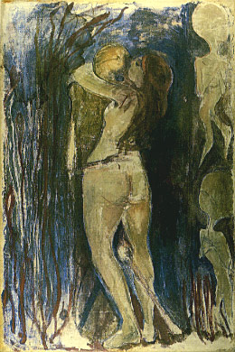 Ο Munch, από την άλλη πλευρά, δημιουργεί μια ατμόσφαιρα φοβερής οικειότητας ανάμεσα στον σκελετό και τη γυναίκα. Το ψιλόλιγνο πόδι του σκελετού ξεπροβάλει ανάμεσα από τους ολοζώντανους μηρούς της γυναίκας και ο εναγκαλισμός της έχει την ίδια ζέση με τον δικό του, αν όχι περισσότερη. Και των δύο καλλιτεχνών οι απεικονίσεις είναι ερωτικά φορτισμένες όμως υπάρχει μια σαφής μετακίνηση από την αντίσταση στην προθυμία.
