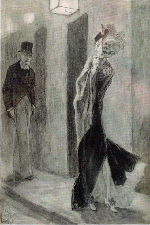 Οι καλλιτέχνες συνέχισαν να χρησιμοποιούν δυσοίωνες γυναικείες φιγούρες για να αναπαραστήσουν τον θάνατο ώς τα τέλη του 19ου και τις αρχές του 20ού αιώνα. Στο σχέδιό του με τίτλο «Η Ανθρώπινη Παρωδία», το 1878, ο βέλγος χαράκτης Félicien Rops εικονογραφεί την παροδική λάμψη της γυναικείας ομορφιάς. Η μορφή που πλησιάζει τον κομψό κύριο και έχει παρουσιαστικό ελκυστικής γυναίκας ντυμένης με ακριβό μαύρο φόρεμα είναι στην πραγματικότητα ένας φρικαλέος σκελετός που φοράει μια περίτεχνη μάσκα. Αυτή είναι η πραγματική παρωδία της ανθρώπινης ύπαρξης, αυτή η μεταμφίεση της θνητότητας με τη βοήθεια απατηλών στολιδιών.