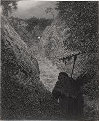 Ένα χαρακτικό του Alfred Rethel από το 1851 με τίτλο «Ο Θάνατος ως Φίλος» δείχνει μια σκελετωμένη φιγούρα η οποία όμως προσομοιάζει περισσότερο σε επαίτη μοναχό παρά σε Χάρο. Είναι ένα προσωποποιημένο πορτρέτο που διατηρεί κάποια από τα στοιχεία του φιλεύσπλαχνου Αγγέλου του Θανάτου: το δρεπάνι του στηρίζεται στον τοίχο όσο εκείνος εκτελεί τα καθήκοντα του κωδωνοκρούστη των νεκρών με πρόσωπο σκυθρωπό και έκφραστη περίλυπη.