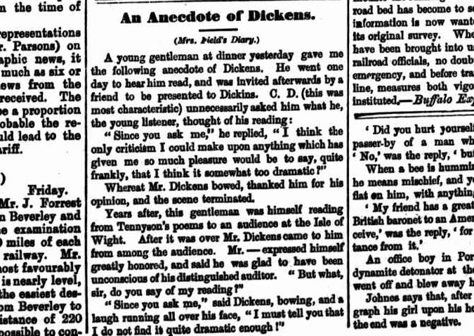 Στην τρίτη σελίδα της εφημερίδας, ανάμεσα σε τοπικές και άλλες ειδήσεις, υπάρχει ένα σύντομο άρθρο με τίτλο An Anecdote on Dickens και από κάτω, εντός παρένθεσης, ο τίτλος της στήλης: Mrs. Field’s Diary. Δε γνωρίζουμε αν είναι υπαρκτό πρόσωπο η Mrs. Fields ή αν πρόκειται για δημοσιογραφικό ψευδώνυμο και οι έρευνες που κάναμε με σκοπό να ανακαλύψουμε περισσότερα δεν έφεραν αποτέλεσμα· συνεπώς δεν είναι εύκολο να αξιολογήσουμε την ακρίβεια αυτής της ιστορίας που διηγείται για τον μεγάλο πεζογράφο σ’ αυτό το άρθρο που δημοσιεύτηκε δέκα χρόνια μετά το θάνατό του. Την παραθέτουμε, ωστόσο, διότι το περιστατικό έχει το γούστο του και μας θυμίζει πολύ τον Ντίκενς.