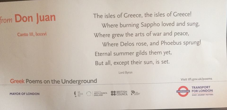 Οι αφίσες με ποιήματα, μεταξύ άλλων της Σαπφούς, του Καβάφη και του Γκάτσου θα κυκλοφορούν μέσα στο λονδρέζικο μετρό: Οι συρμοί θα στολιστούν με ελληνικούς στίχους και εκατομμύρια επιβάτες θα έχουν τη δυνατότητα να τους διαβάσουν στα αγγλικά. Η εκδήλωση πραγματοποιείται στο πλαίσιο των δράσεων της ελληνικής πρεσβείας, κατά τη διάρκεια της εξάμηνης ελληνικής Προεδρίας της ΕΕ.