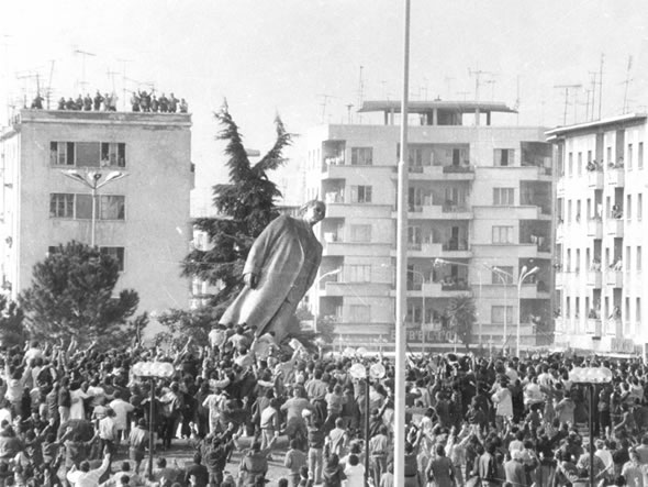 Σκεφτόμουν πόσο πολύ διαφέρει η περίπτωση του απο αυτή ενός άλλου κομμουνιστή ηγέτη και γείτονα του Τίτο: του Αλβανού Εμβέρ Χότζα. Ο Χότζα υπήρξε για τέσσερις δεκαετίες ο ισχυρός άνδρας της Αλβανίας. Οι ομοιότητες με τον Τίτο έντονες: ήταν αμφότεροι ηγέτες της αντίστασης εναντίον των Γερμανών και ακολούθησαν και οι δυο τον δικο τους ιδιαίτερο και μοναχικό δρόμο προς τον κομμουνισμό, με την Αλβανία να είναι η μοναδική χώρα του λεγόμενου ανατολικού μπλοκ που φλέρταρε με την μαοϊκή Κίνα. Επίσης αμφότεροι πέθαναν πριν από την κατάρρευση του «υπαρκτού» — ο Τίτο το ’80, ο Χότζα το ’85. Όμως τα κοινά σταματουν εδώ. Το καθεστώς και η εικόνα του Χότζα κατέρρευσε με κρότο και δεν άφησε πίσω της ούτε νοσταλγούς, ούτε εμπορευματοποιημένα σιμουλάκρα. Σαν σήμερα, στις 20 Φεβρουαρίου του 1991 έπεφτε ο πρώτος αδριάντας του Αλβανού ηγέτη. Η σκηνή, κλασική: συγκεντρωμένα πλήθη στην πλατεία Σκάντερμπεργκ –ή Σκεντέρμπεη, ελληνιστί– των Τιράνων κατεδαφίζουν μετά μανίας το ομοίωμα του μισητού ηγέτη. Οι φωτογραφίες από το γεγονός θυμίζουν την εντυπωσιακή εναρκτήρια σκηνή από τον Οκτώβρη του Αιζενστάιν, όπου μαρτυρούμε την κατάρριψη ενός πελώριου αγάλματος του Τσάρου Αλεξάνδρου ΙΙΙ από τα επαναστατημένα πλήθη στη βασανισμένη Ρωσία.