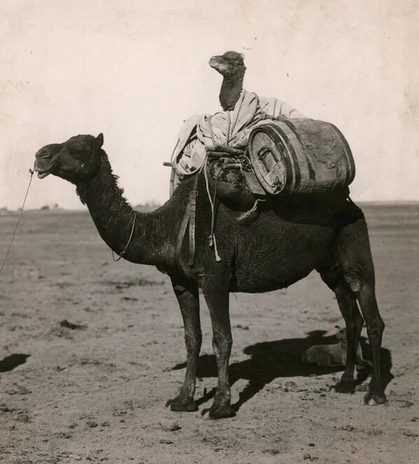 Δυτική Αυστραλία, 1916: μια καμήλα που κουβουλάει (μεταξύ άλλων) το μικρό της (φωτο: C.P. Scott). Η πρώτη καμήλα εισήχθη στην Αυστραλία το 1840 από τα Κανάρια Νησιά. Το 1860 ήρθε μια ολόκληρη ομάδα για να χρησιμοποιηθεί στην εξερευνητική αποστολή των Bourke και Wills. Το 1866 δημιουργήθηκαν οι πρώτες φάρμες αναπαραγωγής, οι εισαγωγές ωστόσο δεν σταμάτσαν, παρ’ όλο που οι αυστραλιανές καμήλες αποδείχτηκαν πολύ γερές και ανθεκτικές, καθώς η ζήτηση ήταν μεγάλη: από το 1860 ως το 1907 υπολογίζεται ότι εισήχθησαν κάπου 10 με 12 χιλιάδες στην Αυστραλία από την Ινδία. Τα καραβάνια αποτελούνταν από περίπου 70 καμήλες και κάλυπταν 20-25 μίλια τη μέρα στην έρημο. Μια μεγάλη καμήλα μπορούσε να κουβαλήσει 600 κιλά. Χρησιμοποιήθηκαν κατά κόρον για την κατασκευή της γραμμής του τηλέγραφου, για έργα ύδρευσης και άρδευσης, σε ορυχεία και, βέβαια, στο γενικό εμπόριο. Γύρω στο 1920, με την επικράτηση των μηχανοκίνητων μέσων μεταφοράς, οι αυστραλιανές καμήλες βγήκαν στη σύνταξη: αφέθηκαν ελεύθερες και σχημάτισαν αγέλες στις ακατοίκητες περιοχές της Αυστραλίας. Υπολογίζεται ότι σήμερα στη χώρα ζουν κάπου 300.000 καμήλες.