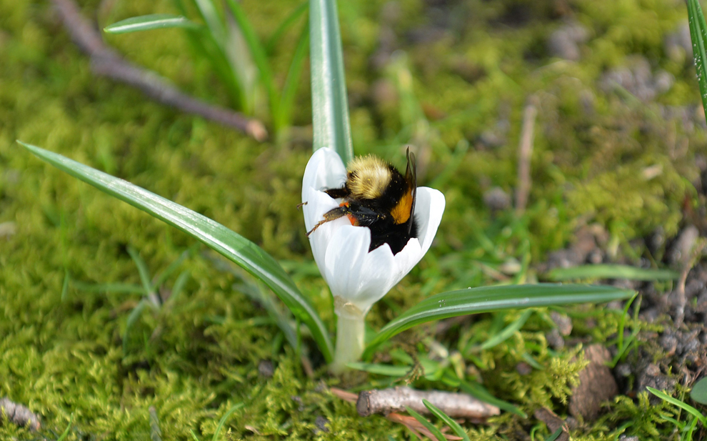Μια μέλισσα έχει βουτήξει στο άνθος ενός κρόκου στο Oldenburg της Γερμανίας, 7 Μαρτίου. (CARMEN JASPERSEN/EPA)