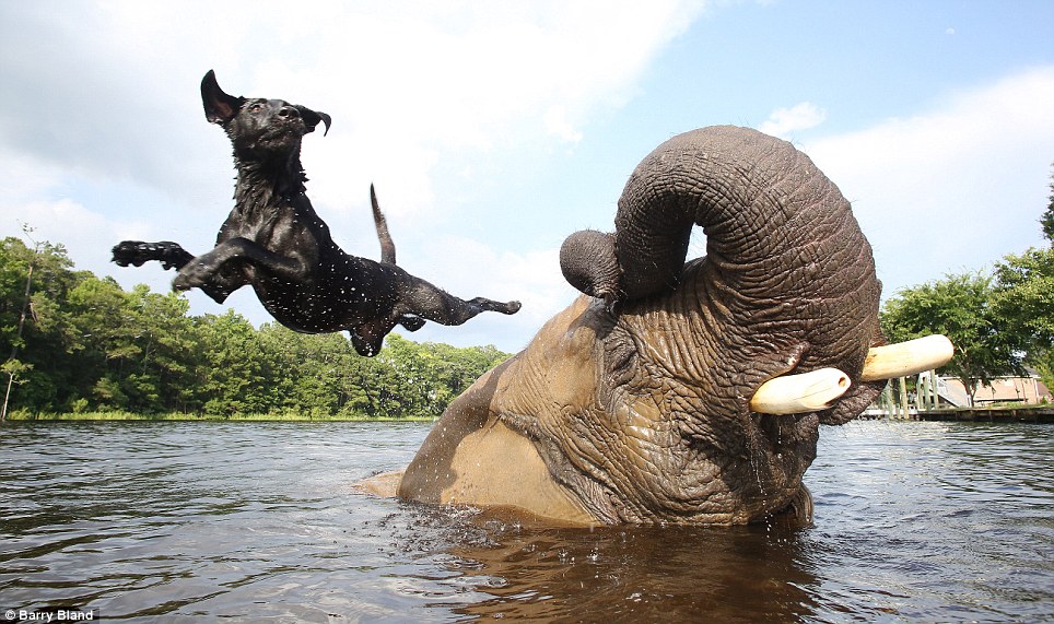 Στο βίντεο και στις φωτογραφίες μπορείτε να απολαύσετε τα δύο ζώα να παίζουν μακαρίως, με την Μπέλα να σκαρφαλώνει στο κεφάλι της Μπαμπλς που της πετάει, με υπομονή ελέφαντα, την μπάλα στο νερό ώστε η λαμπραντορίνα να πηδήξει (από το κεφάλι της ελεφαντίνας) στο νερό να την πιάσει.