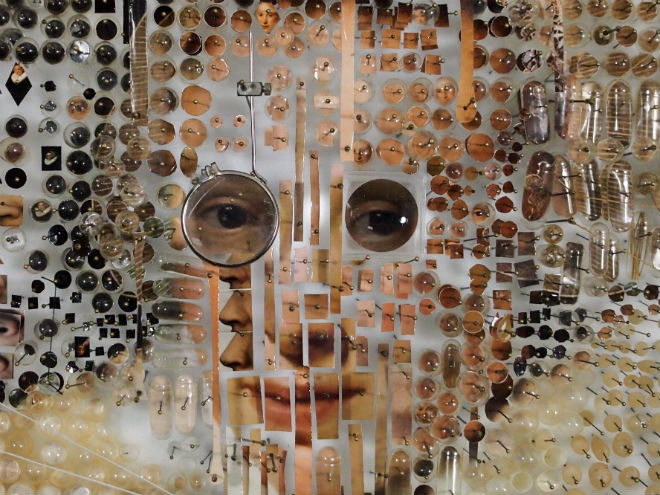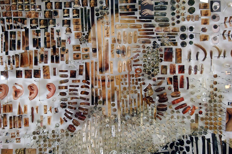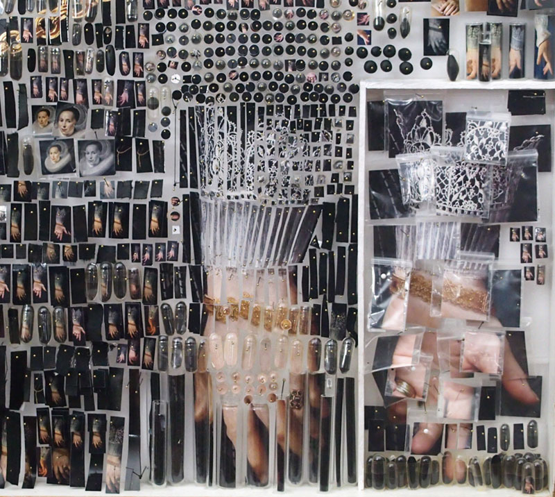Είναι μια μέθοδος που είχα χρησιμοποιήσει και στο παρελθόν. Το αντικείμενο του πίνακα εξετάζεται μέσω μιας ψευδο-επιστημονικής μεθόδου, δουλεύοντας με υλικά και διαδικασίες που συναντά κανείς στην εντομολογία, τη βιολογία και την εγκληματολογία. Η δουλειά μου είναι υπαινικτική μιας μετα-μοντέρνας σχέσης με το υποκείμενο, δηλαδή, δημιουργεί ένα πορτρέτο του προσώπου με μέσο ένα τρισδιάστατο κολάζ. Κάνοντας αυτό, ανακαλύπτω τρόπους με τους οποίους το αρχικό θέμα του πίνακα αποκτά καινούργια νοήματα. Μαζί με χιλιάδες κομμάτια από φωτογραφίες του αρχικού έργου, προσθέτω και ένα μίγμα από υλικά που σκηνοθετώ προσεκτικά: από τούφες μαλλιών μέχρι πρόσφατες φωτογραφίες και ψεύτικα κοσμήματα ─ένα είδος «βιογραφικού DNA».