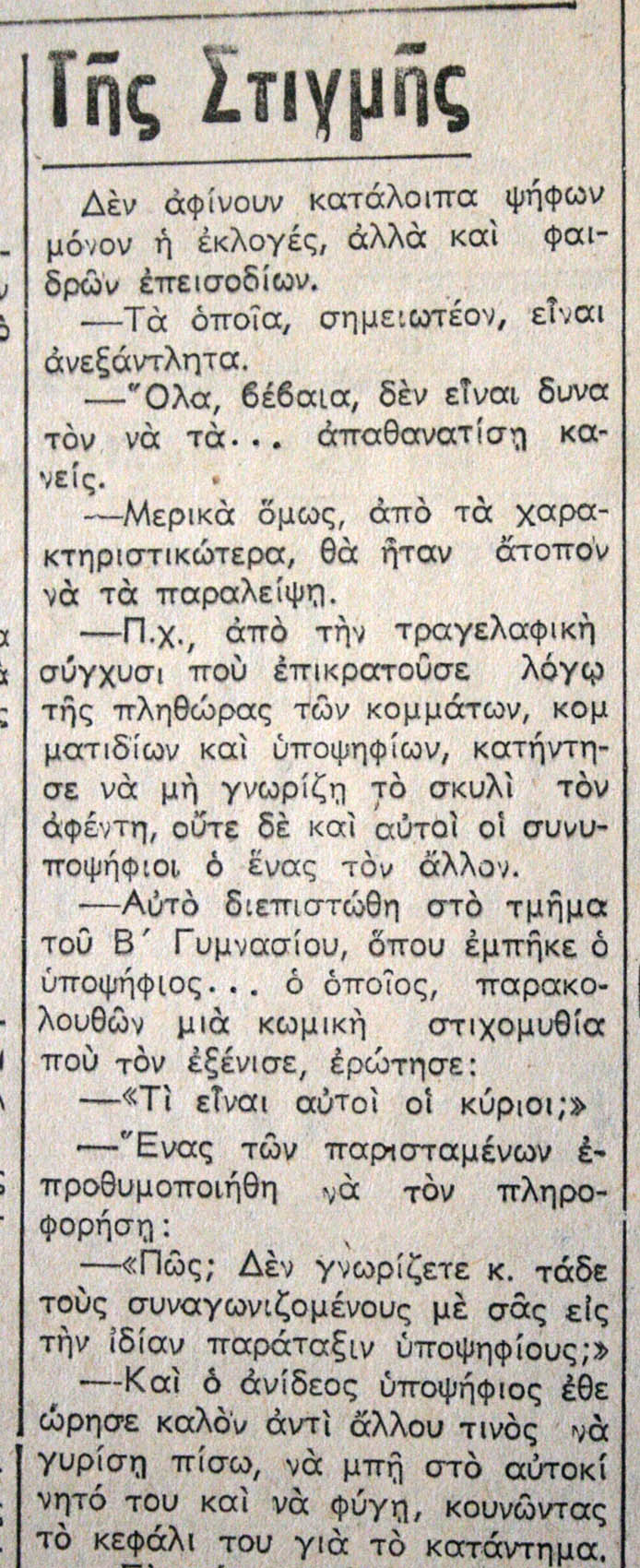 Στον Νεολόγο Πατρών της Πέμπτης 9 Μαρτίου του 1950, διαβάζουμε για άλλον έναν κίνδυνο που κρύβουν οι εκλογές: να αποκαλυφθεί ότι δεν γνωρίζεις τους συνυποψηφίους σου στον ίδιο συνδυασμό (ο πρώτος εκλογικός κίνδυνος που αποκαλύψαμε στην Επισκόπηση Τύπου ήταν να κατέβεις μόνος σου για δήμαρχος και να μην εκλεγείς: Ήτο μοναδικός υποψήφιος αλλά δεν εξελέγη). Προσοχή, λοιπόν, μέρες που ‘ναι…