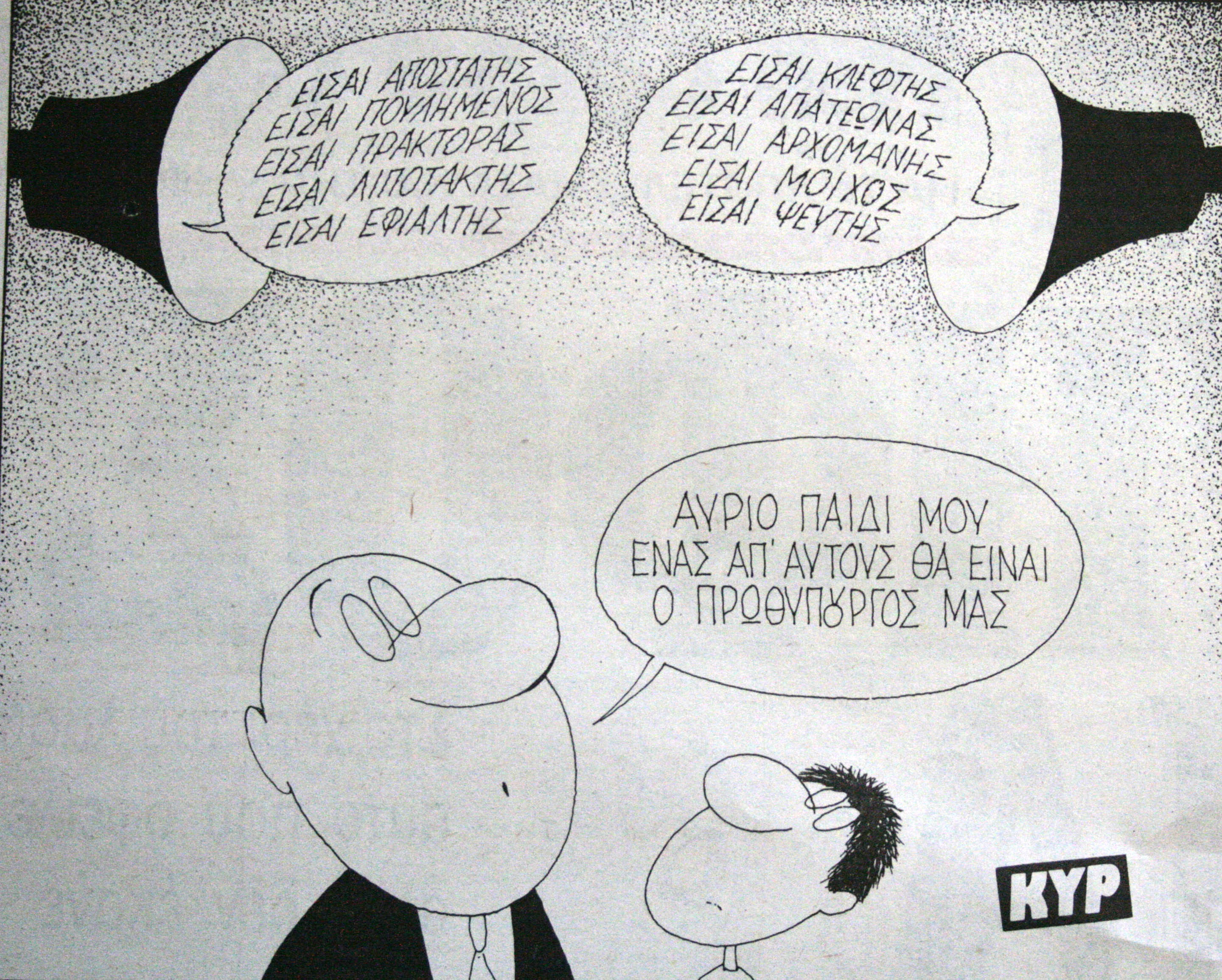 Οι εκλογές της προσεχούς Κυριακής αφορούν την εκλογή ευρωβουλευτών, σε μια περίοδο κρίσιμη για το εγχείρημα της ευρωπαϊκής ολοκλήρωσης. Το dim/art θεωρεί ότι κατά τη διάρκεια της προεκλογικής εκστρατείας θα έπρεπε να έχουμε μιλήσει πολύ περισσότερο για το ποια Ευρώπη θέλουμε και πώς θα τη διαμορφώσουμε· επειδή, ωστόσο, από πολλές πλευρές μπήκαν διλήμματα και λογικές «δημοψηφίσματος» που αφορούν αποκλειστικά το εσωτερικό πολιτικό σκηνικό, ενδίδουμε κι εμείς και αναδημοσιεύουμε από την Κυριακάτικη Ελευθεροτυπία της 18ης Ιουνίου 1989 την εξαιρετική αυτή γελοιογραφία του ΚΥΡ, την οποία αφιερώνουμε στους «δύο μονομάχους», μαζί με τον στίχο του Μανώλη Ρασούλη: Όλα τριγύρω αλλάζουνε κι όλα τα ίδια μένουν.