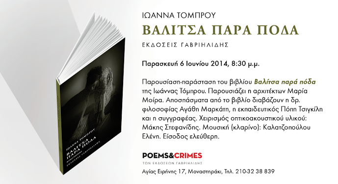 Με μια παρουσίαση-παράσταση θα συστήσουν στο βιβλιοφιλικό κοινό το βιβλίο με τίτλο Βαλίτσα παρά πόδα, οι εκδόσεις Γαβριηλίδη και η συγγραφέας του Ιωάννα Τόμπρου, αύριο, Παρασκευή 6 Ιουνίου, στις 8.30μ.μ., στον πολιτιστικό χώρο Poems & Crimes.