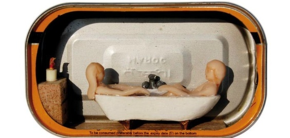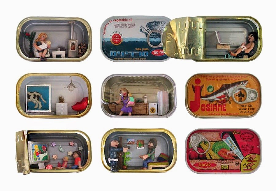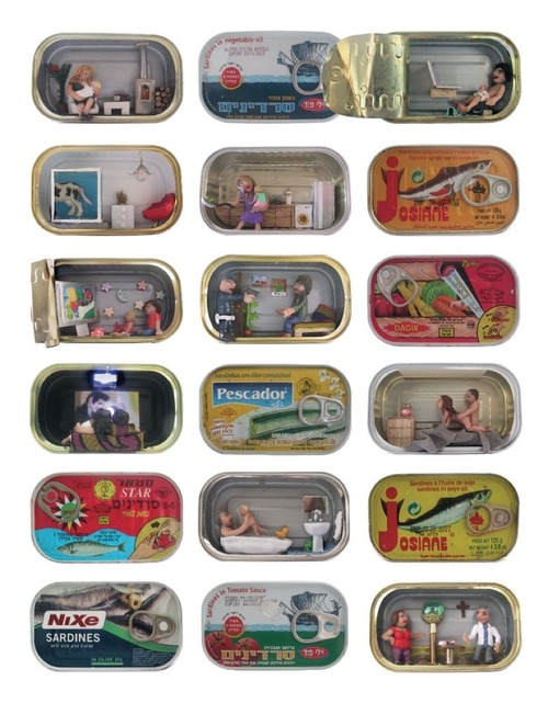 Στριμωγμένες μέσα σ’ ένα σαρδελοκούτι διαστάσεων 6 επί 10 εκατοστά, οι μινιατούρες που δημιουργεί η γλύπτρια Nathalie Alony για το project με ονομασία Home Sweet Home αποτελούν ένα χιουμοριστικό όσο και καυστικό σχόλιο για τον κόσμο μας και για τη ζωή που ζούμε περιορισμένοι στους τέσσερεις τοίχους των διαμερισμάτων μας. Καθεμία από τις περίτεχνες αυτές φιγούρες ─άντρες, γυναίκες, παιδιά, αγαπημένα κατοικίδια─, ζει έγκλειστη μέσα στα στενά όρια του τενεκεδένιου σπιτιού της, μέσα σε οικογενειακούς και προσωπικούς μικρόκοσμους που υπάρχουν ανεξάρτητα από τον έξω κόσμο. Παρά την απομόνωση και την αυτοτέλεια που έχει ο κάθε ένας από αυτούς, όλοι μαζί —ή, καλύτερα, όλα μαζί τα σαρδελοκούτια της Alony— συνθέτουν ένα σύμπλεκτο δίκτυο που κοιμάται και ξυπνάει ως ενωμένη κοινότητα, μια κοινότητα που τη χωρίζουν μόνο, λεπτοί τενεκεδένιοι τοίχοι.