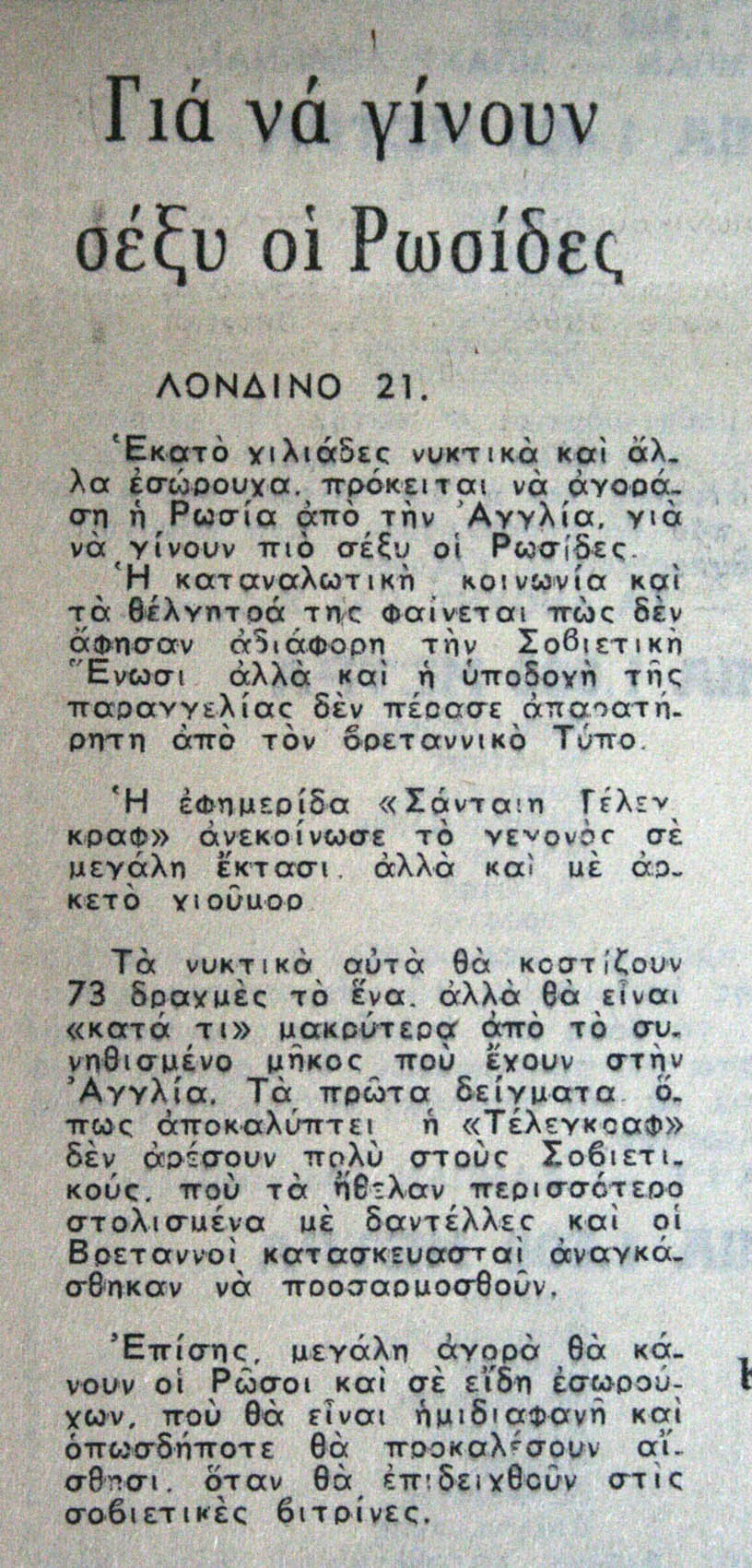 Για τη μεν Ε.Σ.Σ.Δ μαθαίνουμε ότι εκατό χιλιάδες νυκτικά και άλλα εσώρουχα πρόκειται να αγοράση η Ρωσία από την Αγγλία, για να γίνουν σέξυ οι Ρωσίδες.