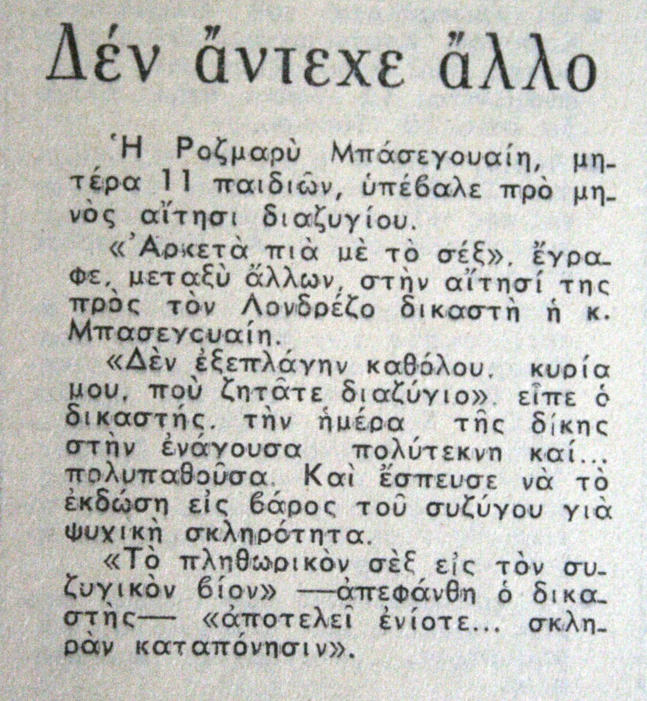 Από την άλλη πλευρά, διαβάζουμε για το δράμα της Ροζμαρύ Μπάσεγουαίη (sic), η οποία κατέφυγε στο δικαστήριο και ζήτησε διαζύγιο διότι δεν άντεχε άλλο το σεξ. Ευτυχώς, η κυρία Μπάσεγουαίη (sic) αντιμετωπίστηκε από την έδρα με κατανόηση.