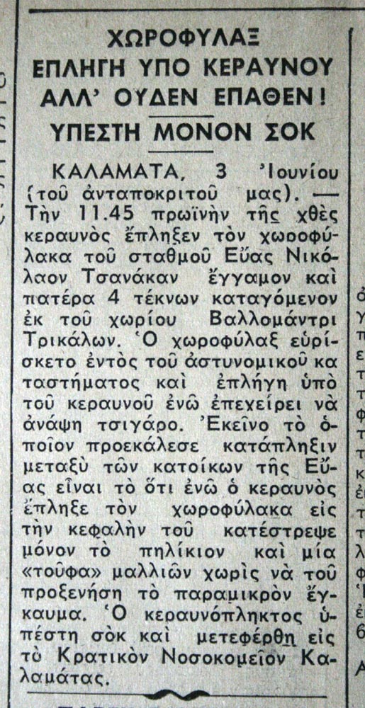 Στη Βραδυνή της 3ης Ιουνίου 1963 διαβάζουμε την παράξενη ιστορία του χωροφύλακα Νικόλαου Τσανάκα, που τον χτύπησε κεραυνός την ώρα που άναβε τσιγάρο μέσα στο αστυνομικό τμήμα. Η εφημερίδα δεν διευκρινίζει κατά πόσον ο χωροφύλαξ είχε υποσχεθεί να το κόψει ή, έστω, να μην καπνίζει εντός του τμήματος — σας ορκίζομαι, κύριε Ενωματάρχα, να πέσει φωτιά να με κάψει…