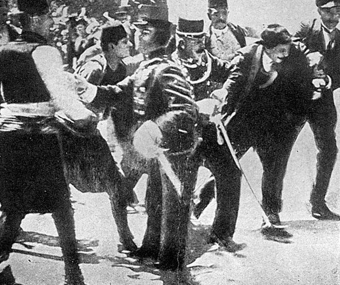 Σεράγιεβο, 28 Ιουνίου 1914, σαν αύριο πριν από εκατό χρόνια, κατά τη δολοφονία του Αρχιδούκα Φραγκίσκου Φερδινάνδου, που αποτέλεσε την αφορμή για την έκρηξη του Α΄ Παγκοσμίου Πολέμου. Στη φωτογραφία δεν απεικονίζεται ο δολοφόνος Γκαβρίλο Πρίντσιπ, όπως συχνά θεωρείται, αλλά ένας άλλο συνωμότης, ο Νέντελκο Τσαμπρίνοβιτς. Ο Τσαμπρίνοβιτς αποπειράθηκε πρώτος να σκοτώσει τον αυστριακό διάδοχο, αλλά η βόμβα που πέταξε στο αυτοκίνητο γκελάρησε στην υφασμάτινη οροφή, κατρακύλησε κι έσκασε ύστερα από μερικά δευτερόλεπτα κάτω από επόμενο αυτοκίνητο της πομπής, τραυματίζοντας σοβαρά δύο μέλη της συνοδείας και μερικούς από τους παριστάμενους. Ο Τσαμπρίνοβιτς προσπάθησε να αυτοκτονήσει με κυάνιο, που όμως ήταν ληγμένο και του προκάλεσε απλώς εμετό. Για σιγουριά βούτηξε και στον ποταμό Μιγιάτσκα να πνιγεί, αλλά μάταια, καθώς το βάθος ήταν μόλις δέκα (10) εκατοστά. Στη φωτογραφία, η στιγμή της σύλληψής του από την αστυνομία.
