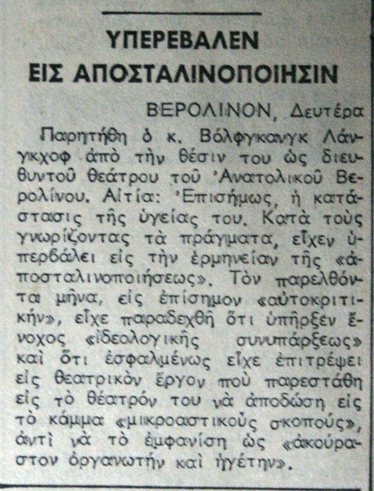 Σε όλα χρειάζεται μέτρο. Το έλεγαν οι αρχαίοι Έλληνες αλλά όχι οι αρχαίοι Γερμανοί, ως εκ τούτου το αγνοούσε ο κ. Βόλφγκανγκ Λάνγκχοφ, διευθυντής του θεάτρου του (Ανατολικού, τότε) Βερολίνου, ο οποίος, όπως μας πληροφορεί η Ακρόπολις της 27ης Μαΐου του 1963, το παράκανε στην αποσταλινοποίηση, κι έτσι οι αρμόδιοι είπαν να τον επανασταλινοποιήσουν λιγάκι, να έρθει στα ίσα του.