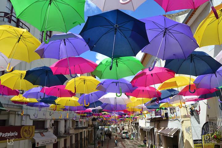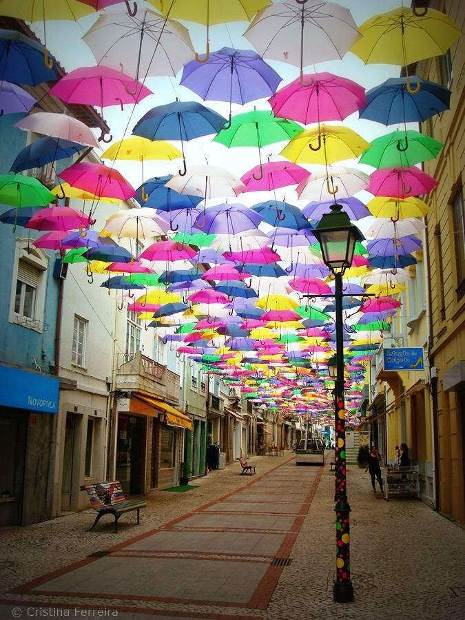 Κάθε χρόνο, από αρχές Ιουλίου και για τρεις μήνες, ένα στρώμα από πολύχρωμα παρασόλια κρύβουν τον ουρανό πάνω από την πορτογαλική πολίχνη της Agueda. Η εικαστική αυτή παρέμβαση γίνεται τα τελευταία 3 χρόνια στο πλαίσιο του τοπικού καλλιτεχνικού φεστιβάλ Agitagueda και είναι μια δημιουργία της εταιρείας παραγωγής Sextafeira Producoes. Το concept είναι το ίδιο, και μόνο η χρωματική παλέτα στην οποία κινούνται οι ομπρέλες έχει αλλάξει φέτος, από τα πιο σκούρα πρωτογενή χρώματα που επικρατούσαν πέρσι, σε πιο ανοιχτά και φρέσκα, με μια ιδέα από μωβ και σκούρο μπλε.