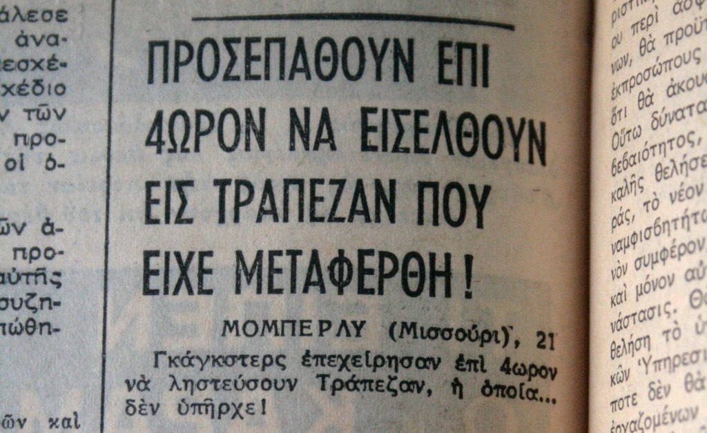 Μια αντίστοιχη —αλλά πραγματική— ιστορία περιγράφει η εφημερίδα Νέα Πολιτεία στις 21 Οκτωβρίου του 1969, με βάση το σχετικό ρεπορτάζ του Associated Press: στο Clifton Hill του Μιζούρι, ομάδα διαρρηκτών, εφοδιασμένη με λοστούς, οξυγόνο και ειδικές συσκευές απενεργοποίησης συναγερμού, χτύπησε μια τράπεζα. Μετά από πολύωρες προσπάθεις, κατάφεραν να διαρρήξουν την εξωτερική και την εσωτερική πόρτα. Μόνο που η τράπεζα είχε μεταφερθεί από καιρό και το κτίριο ήταν άδειο. Την ληστείαν ανεκάλυψεν χθες την πρωίαν ο ιδιοκτήτης του κτιρίου, ο οποίος μετέβη εκεί τυχαίως.