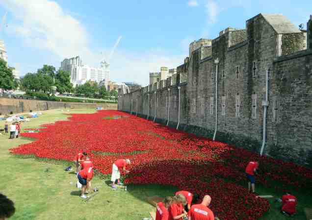 Εδώ και αρκετές εβδομάδες, μια ομάδα από 150 εθελοντές φτιάχνουν και τοποθετούν τις παπαρούνες, μία-μία, γύρω από τον Πύργο. Μάλιστα, σε μία χειρονομία με συμβολικό χαρακτήρα, την πρώτη «φύτεψε» ο Crawford Butler, o πιο παλιός Φύλακας του Πύργου (ένας από τους χαρακτηριστικούς «Beefeater»). Η τελευταία θα φυτευτεί την Ημέρα της Ανακωχής, δηλαδή, στις 11 Νοεμβρίου, που είναι η μέρα οπότε δόθηκε οριστικό τέλος στις εχθροπραξίες του Πρώτου Παγκοσμίου Πολέμου.