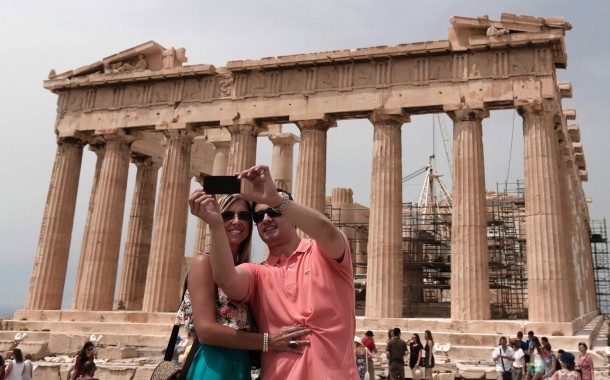 Λεζάντα: Σέλφι μπροστά στην Ακρόπολη. Η τσάντα πρέπει να παραμένει κοντά στο σώμα, ώστε να αποτρέπονται οι τσαντάκηδες.