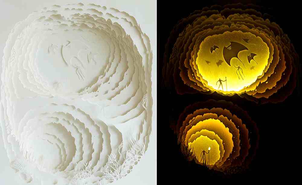 Στη νέα έκθεση που διοργανώνει η Black Book Gallery στο Ντένβερ του Κολοράντο εκθέτει τις νέες του δημιουργίες το καλλιτεχνικό δίδυμο Hari & Deepti, με γενικό τίτλο Oh, The Places You Will Go! (σε ελεύθερη απόδοση, «Α, Και Πού Δεν Θα Πάτε!») Οι δύο καλλιτέχνες εμπνεύστηκαν από τα πρόσφατα ταξίδια τους στη Γιούτα και στο Πάρκο Γιέλοουστοουν και μεταμόρφωσαν τις εντυπώσεις τους σε ντελικάτα γλυπτά από χαρτί, που ξεχειλίζουν από μυθολογία και επιστημονική φαντασία. Καθένα από τα χάρτινα γλυπτά αποτελεί και ένα φωτεινό κουτί, που φωτίζεται από πίσω με LED. Τα κουτιά εκτίθενται σε σκοτεινό χώρο, για να μεγιστοποιείται η εντύπωση. Αν σας αρέσουν τα έργα τους όσο αρέσουν σε μας, μπορείτε να παρακολουθείτε την καλλιτεχνική παραγωγή των Hari & Deepti και στο Instagram.