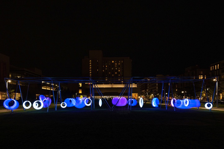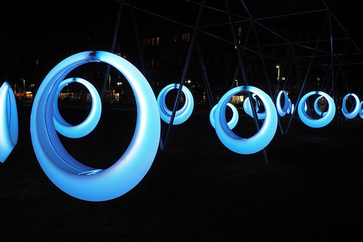 Οι 20 διαφορετικής διαμέτρου στρογγυλές κατασκευές είναι φτιαγμένες από πολυπροπυλένιο και κρύβουν μέσα φωτισμό LED με μικρο-αισθητήρα κίνησης έτσι ώστε να αλλάζουν χρώμα: όταν είναι ακίνητες, εκπέμπουν ένα απαλό άσπρο φως· ενώ όταν αιωρείται πάνω τους ένας επισκέπτης, τα φωτεινά δαχτυλιδια παίρνουν ολοένα και πιο σκούρες αποχρώσεις του μπλε, ξεκινώντας από γαλάζιο και φτάνοντας μέχρι μωβ.