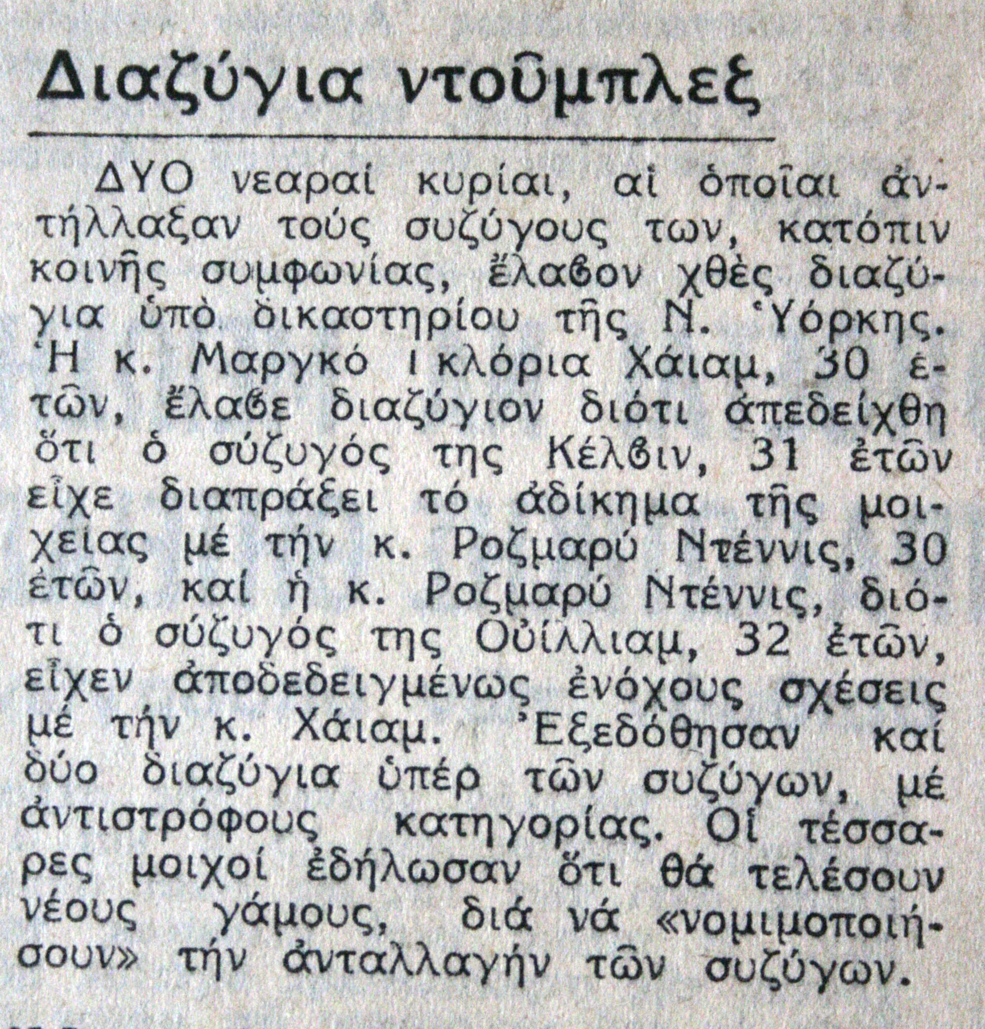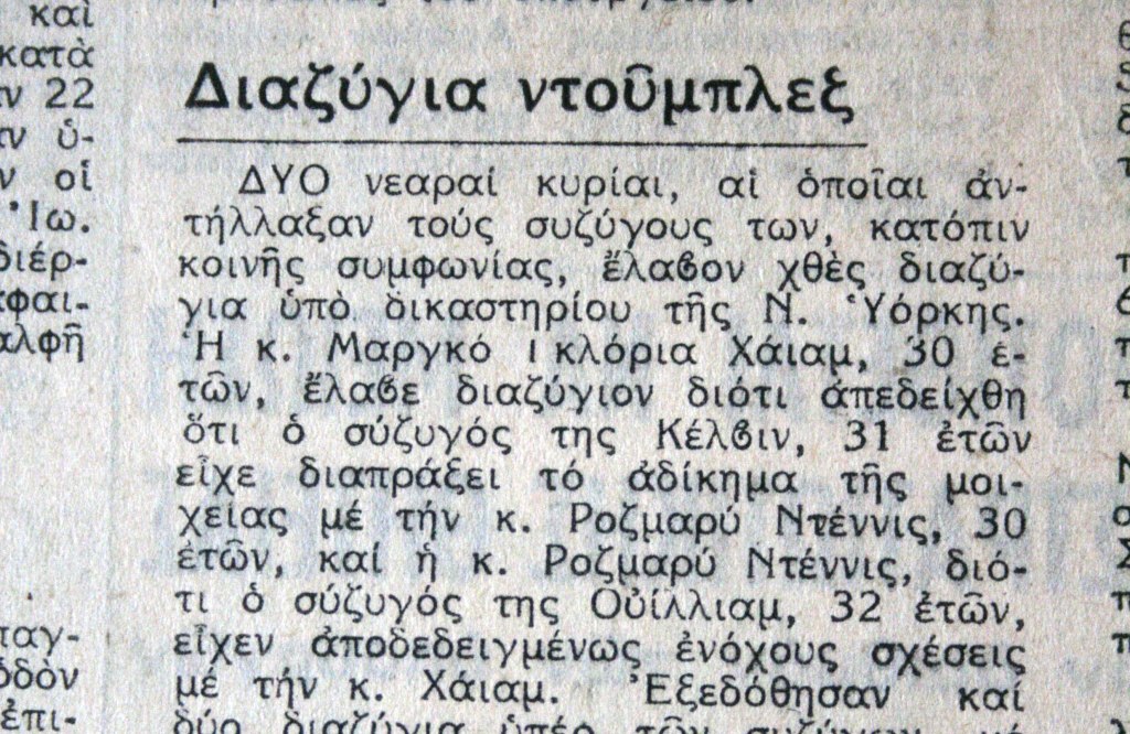 Στον Ελεύθερο Κόσμο (8/10/1969) διαβάζουμε για μια ανταλλαγή συζύγων στη Νέα Υόρκη με τη βούλα του δικαστηρίου: δύο ζευγάρια χώρισαν γιατί ο καθένας απατούσε τον άλλον με έναν από το άλλο ζευγάρι, και ξαναπαντρεύτηκαν ο καθένας με εκείνον / εκείνη που πριν… Χμ, ίσως δεν είναι σαφές… Ας πούμε ότι τα ζευγάρια είχαν παράνομο δεσμό χιαστί ή ότι ξαναανακατεύτηκε μια τράπουλα με τέσσερα χαρτιά (δυο ντάμες, δυο βαλέδες). Εν πάση περιπτώσει, είναι περίπλοκο, διαβάστε το και θα καταλάβετε. Ουφ…