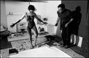 French artist Yves KLEIN directing a model in «body art painting».