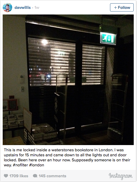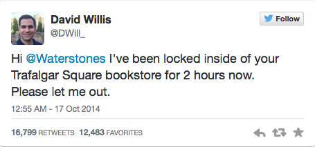 Ο Willis βρισκόταν σε έναν από τους πάνω ορόφους του βιβλιοπωλείου (δεν διευκρινίζεται τι χάζευε ακριβώς εκείνη την ώρα), όταν ξαφνικά συνειδητοποίησε πως τα φώτα έσβησαν. Κατεβαίνοντας, είδε –φευ– και τις πόρτες κλειστές. Ο Willis τότε έκανε αυτό που είναι το φυσικότερο πράγμα στις μέρες μας: έγραψε για την κατάστασή του στο twitter. Ακολούθησε ένα παγκόσμιο διαδικτυακό πάρτι, με 17.000 re-tweets, με συμβουλές για το πώς να βγει αλλά, όπως φαίνεται, κυρίως με σχόλια για το πόσο τυχερός είναι και συμβουλές για το τι να διαβάσει το βράδυ.