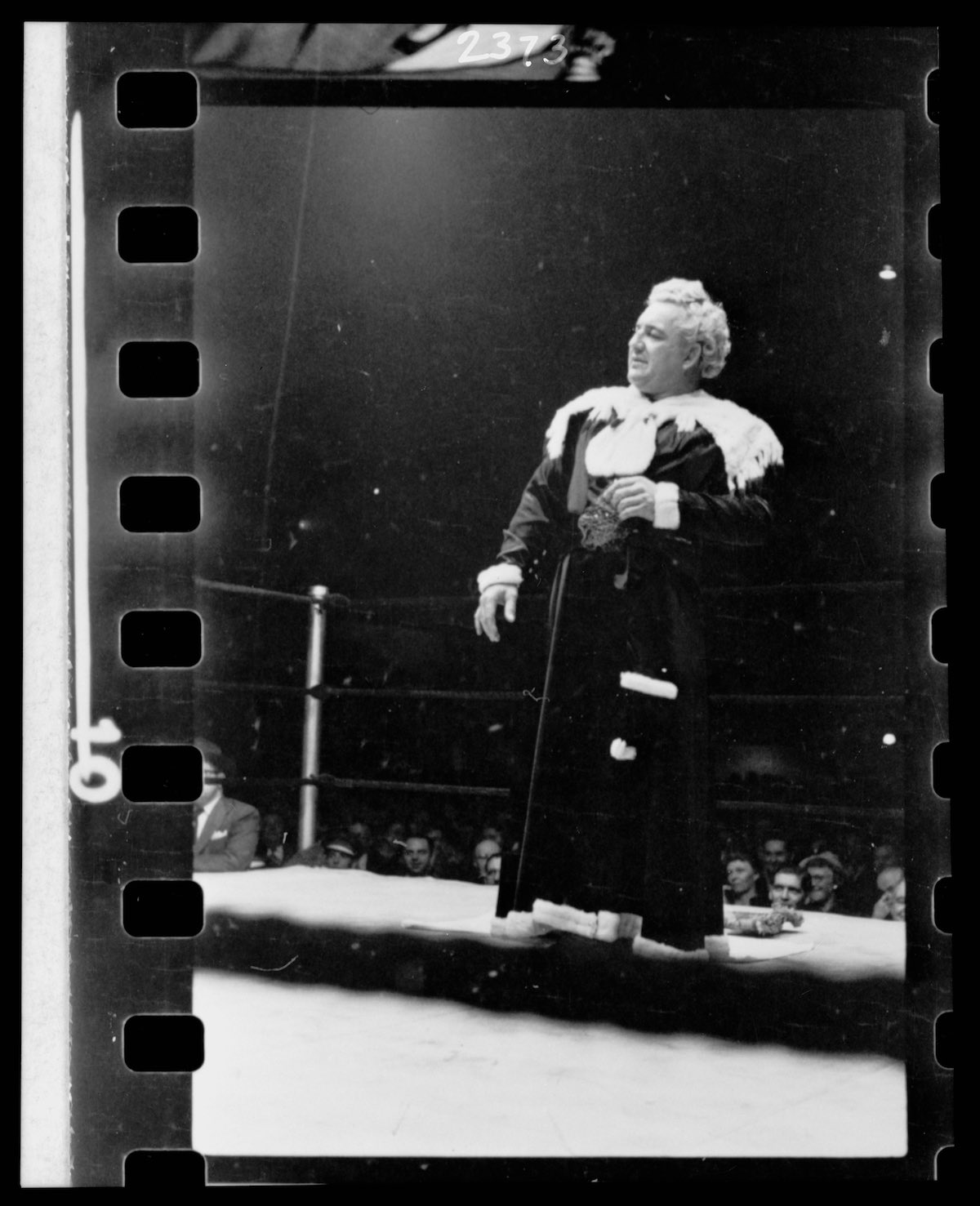 Gorgeous George, full-length portrait, standing in wrestling ring, facing left