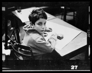 Young boy, half-length portrait, seated at desk, in classroom in Chicago, Illinois