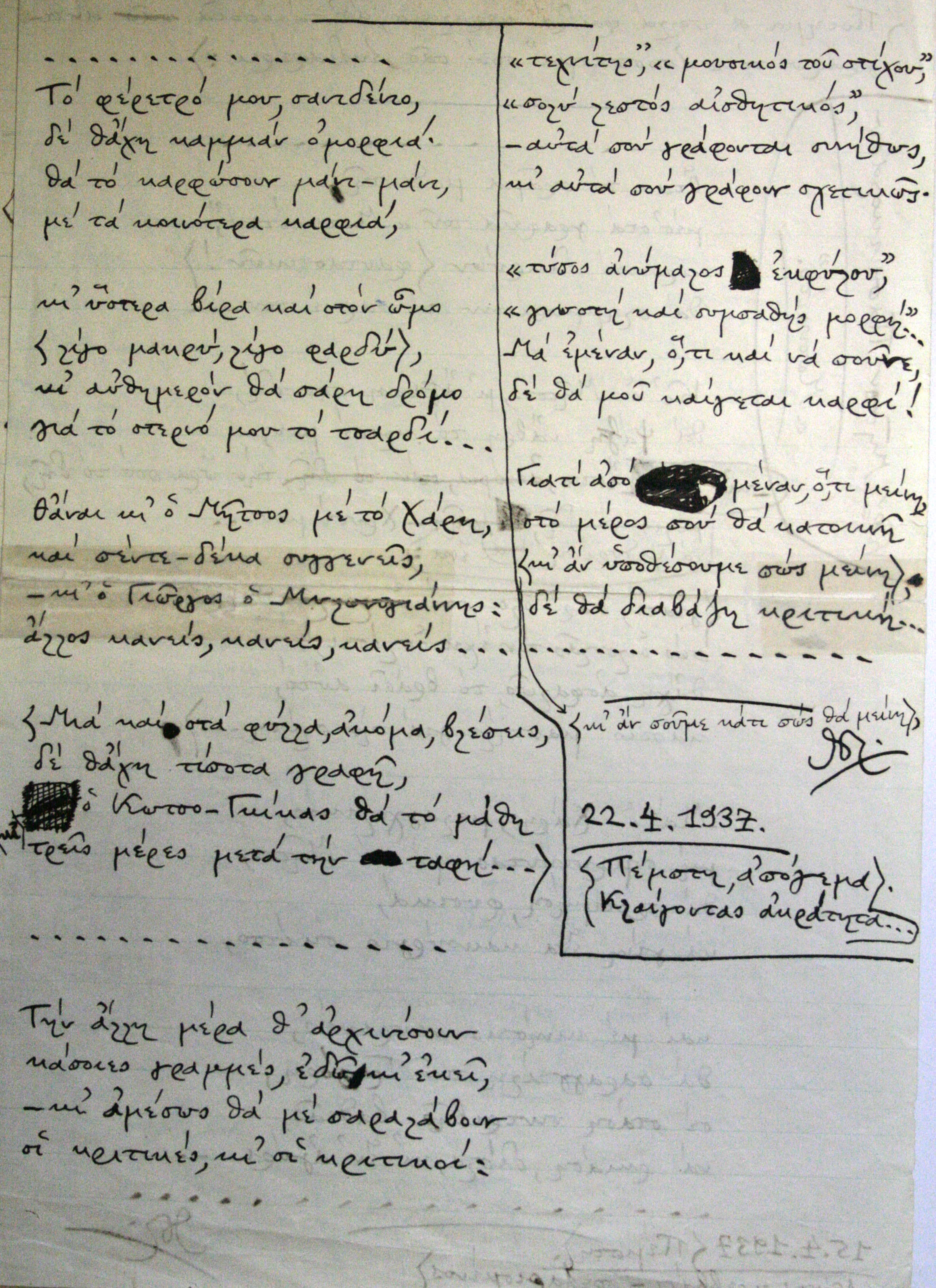 «Άρχισα να γράφω ποιήματα και δράματα, που τα παράσταινα στο σπίτι σ΄ένα αυτοσχέδιο, μικρούλι θεατράκι, με χρωματιστά, χαρτένια πρόσωπα και με σκηνογραφίες και αυλαία δικής μου εντελώς επινοήσεως! Ένα απ’ αυτά τα έμμετρά μου δράματα έλαβε τύχη κάπως ιδιαίτερη: Μου το τύπωσε για δώρο ο πατέρας μου και το μοίρασα σε φίλους, ακόμα και σε μερικούς καθηγητές μου… Τίτλος του, καθώς κι η υπόθεσή του, ρωμαϊκής εμπνεύσεως, αρχαίας: “Νέρων, ο Τύραννος”, δράμα εις δύο πράξεις! Έπαιζα, ακόμα, και κωμωδίες μονόπρακτες του Λάσκαρη, του Κορομηλά και του Αννίνου: Ήταν το “Ζητείται υπηρέτης”, “Ο θάνατος του Περικλέους”, “Η Ελενίτσα της οδού Αγχέσμου” κι άλλα. Μάζευα τα ξαδέλφια μου, αρσενικά και θηλυκά, κι έπαιζα μόνος μου όλων τους τα πρόσωπα, κάνοντας τις δίαφορες φωνές. Στο “Νέρωνα τον Τύραννο” υπήρχε κι ένας αναχρονισμός, ένας πρώτου μεγέθους μαργαρίτης! Σε κάποιο μέρος, η Οκτάβια έλεγε στον Οκτάβιο, τη στιγμή που αυτός λιποψυχούσε απ’ τον φλογερό τον έρωτά του: … “Αλλά, Οκτάβιε, λοιπόν, τι έχεις; Έχεις ρίγη; Το πρόσωπό σου χλώμιασε! Θέλεις σαμπάνια λίγη;” Πριν όμως τυπωθεί, ο πατέρας μου επενέβη και μου τον διόρθωσε: “Το πρόσωπό σου χλώμιασε! Τις αφορμή σε θίγει;” Κι έτσι το έργο είδε, άμεμπτο, το φως, σε άψογους και ομαλότατους δεκαπεντασύλλαβους…»