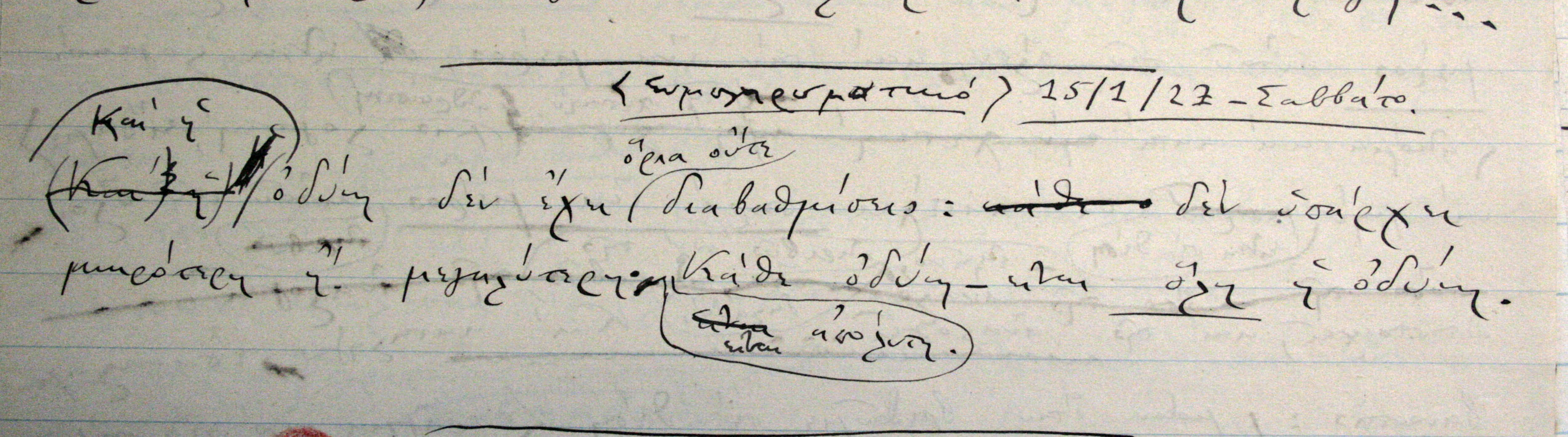 Ψίθυροι, άλλοτε καλοί και κολακευτικοί, κι άλλοτε σκανδαλίσματος κι αποδοκιμασίας με παρακολουθούσαν ώς το Σύνταγμα. Κι όταν καθήσαμε στο τέλος στου “Ντορέ” ─κέντρο κοσμικό παροιμιώδες, μοναδικό, μαζί με του “Γιαννάκη”─ είχαμε το συναίσθημα πως κάναμε έναν καθαρό ηρωισμό! Και στο Φάληρο, που πήγα υστερότερα, έγιναν τα ίδια και χειρότερα […] Από τότε, λοιπόν, άρχισα να βγαίνω πιο αργά, όλο και πιο αργά ─ώσπου, μετά χρόνια αρκετά, έφτασα να βγαίνω μόνο βράδι, τόσο που οι οικείοι μου με λέγαν “νυχτερίδα”. Αλλά και η μετά το φαγητό, πολύ νυχτερινή μου περιπλάνηση, και μάλιστα στις μικροσυνοικίες ─στο Μεταξουργείο, το Θησείο, τη Δεξαμενή και το Παγκράτι─ από τότε ακριβώς χρονολογείται… Μια περιέργεια βαθειά και ανεξήγητη, ένα βαθύ και διαρκές ενδιαφέρον, μ’ έσπρωχνε στο να βλέπω τη ζωή, τους ανθρώπους, τις συνήθειές τους, πλαισιωμένα, και πολύ πιο καθαρά, από το μυστήριο της νύχτας! Γύριζα σπίτι μου κατόπιν, κουρασμένος από περιπλανήσεις κι επεισόδια, με το κεφάλι μου γεμάτο εντυπώσεις… Και σ’ αυτές μου τις περιπλανήσεις, προτιμούσα την τέλεια μοναξιά, για να είμαι ελεύθερος να περπατώ στην τύχη, σύμφωνα με το κέφι μου και τη διάθεσή μου! Αλλά, παράλληλα, σ’ αυτό, είχα σχηματίσει και παρέες από παιδιά απλά, που με σεβόντουσαν, που μ’ αγαπούσαν και που μ’ εκτιμούσαν, σχεδόν σε κάθε γωνιά της πρωτευούσης (τότε μικρής και περιορισμένης) και δεν είχα παρά να διαλέξω το πού θα κατευθύνω την πορεία μου και ποια απ’ όλες, συντροφιά θα προτιμούσα! Ήμουν, αυτή την εποχή ─κι όπως το βλέπω τώρα─ ένας μικρός “κατακτητής” στο είδος μου ─ κάτι σαν δημοφιλής κι “υποψήφιος”, με το πλήθος των γνωριμιών μου και με τον τρόπο που εκείνες με λογάριαζαν και που με θεωρούσαν “αρχηγό” τους!»