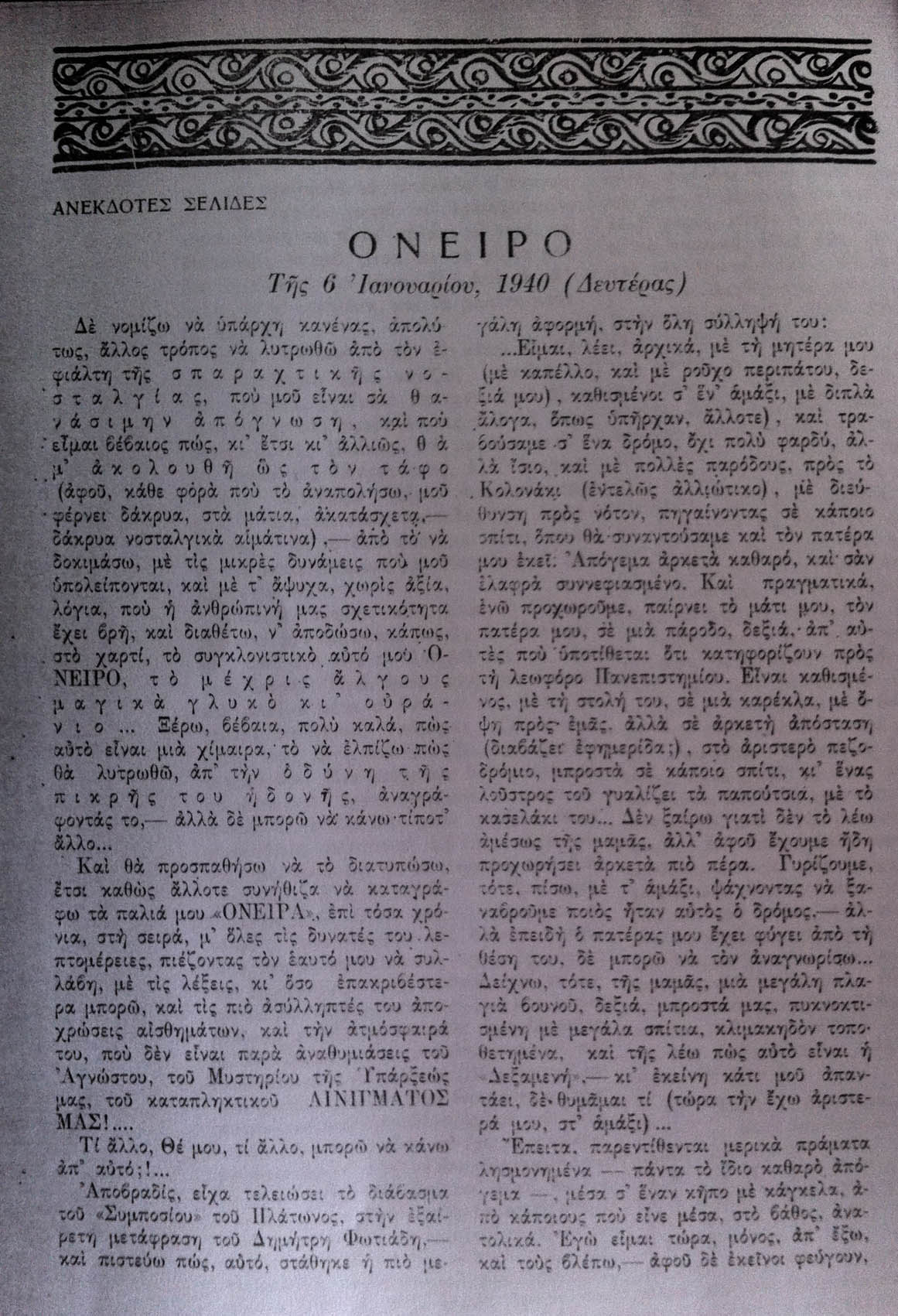 [Στο τεύχος 881 της Νέας Εστίας, τχ. 75, 15/3/1964, τεύχος αφιερωμένο στον Λαπαθιώτη, 20 χρόνια μετά το θάνατό του, δημοσιεύεται μέρος του ανέκδοτου αρχειακού υλικού του. Από εκεί, η καταγραφή ενός ονείρου του, που, όπως σημειώνει, τον συγκλόνισε.]