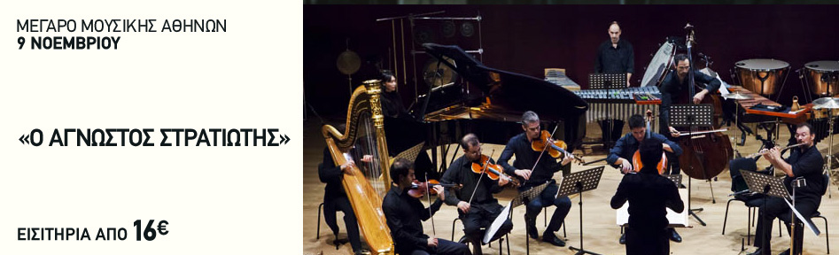 Το Μέγαρο Μουσικής Αθηνών, σε συνεργασία με το European Concert Hall Organisation – ECHO και με την υποστήριξη του Προγράμματος «Πολιτισμός της Ευρωπαϊκής Ένωσης», παρουσιάζει αποκλειστικά απόψε, εν είδει αφιερώματος για τα 100 χρόνια από τον Α΄ Παγκόσμιο Πόλεμο, το Ergon Ensemble, υπό τη διεύθυνση του Μίλτου Λογιάδη, και, σε πρώτη πανελλήνια εκτέλεση το έργο του Γιώργου Απέργη «Ο άγνωστος στρατιώτης», που ερμηνεύει ο βαρύτονος Χόλγκερ Φαλκ, μαζί με την «Ιστορία του στρατιώτη» του Ίγκορ Στραβίνσκι, με τον βαθύφωνο Τάσο Αποστόλου και τον ηθοποιό Φάνη Μουρατίδη.